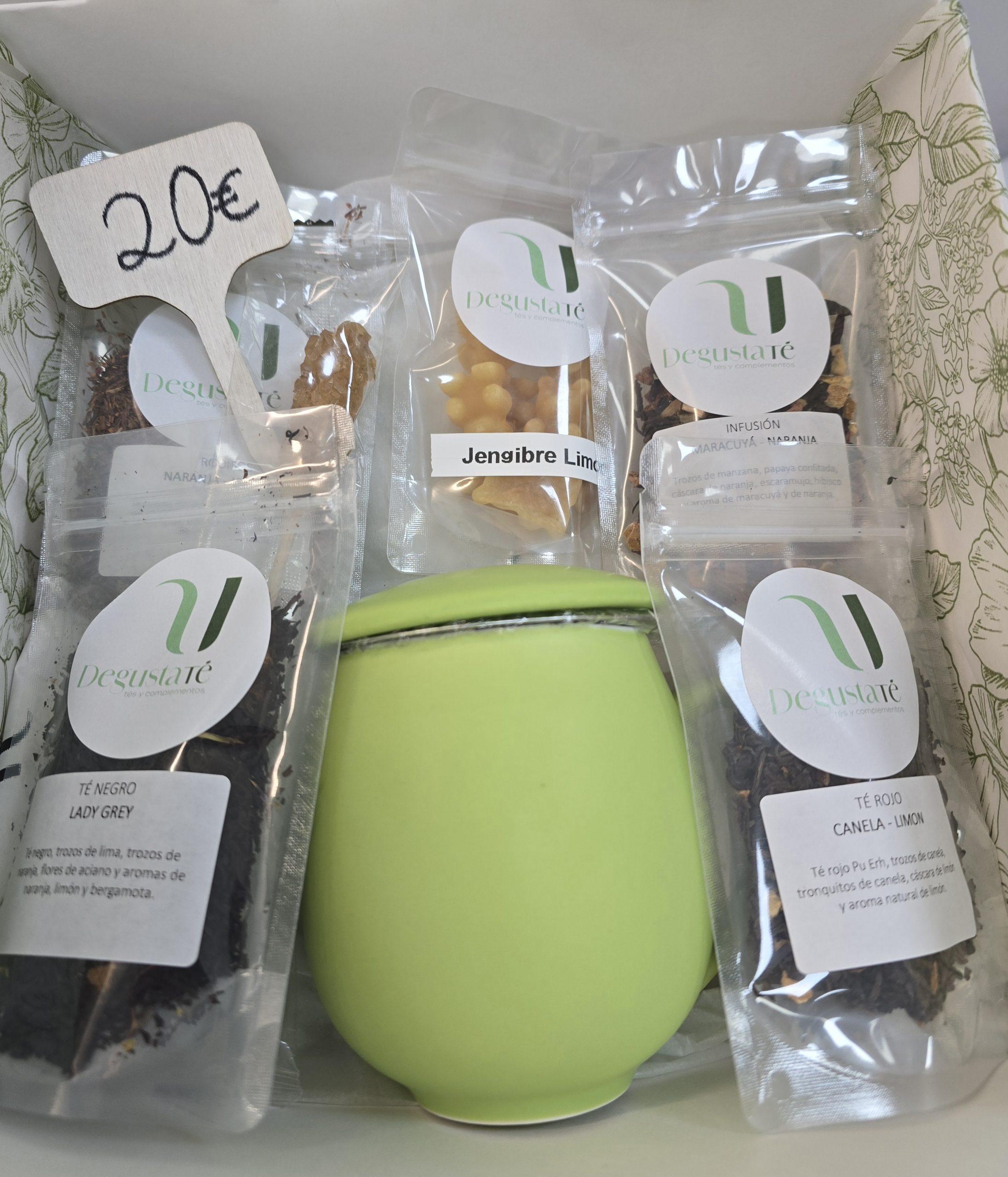 taza ZAARA con filtro, palito azucar moreno, 4 variedades de té o infusiones a elegir + bolsita de ositos de sabores a elegir