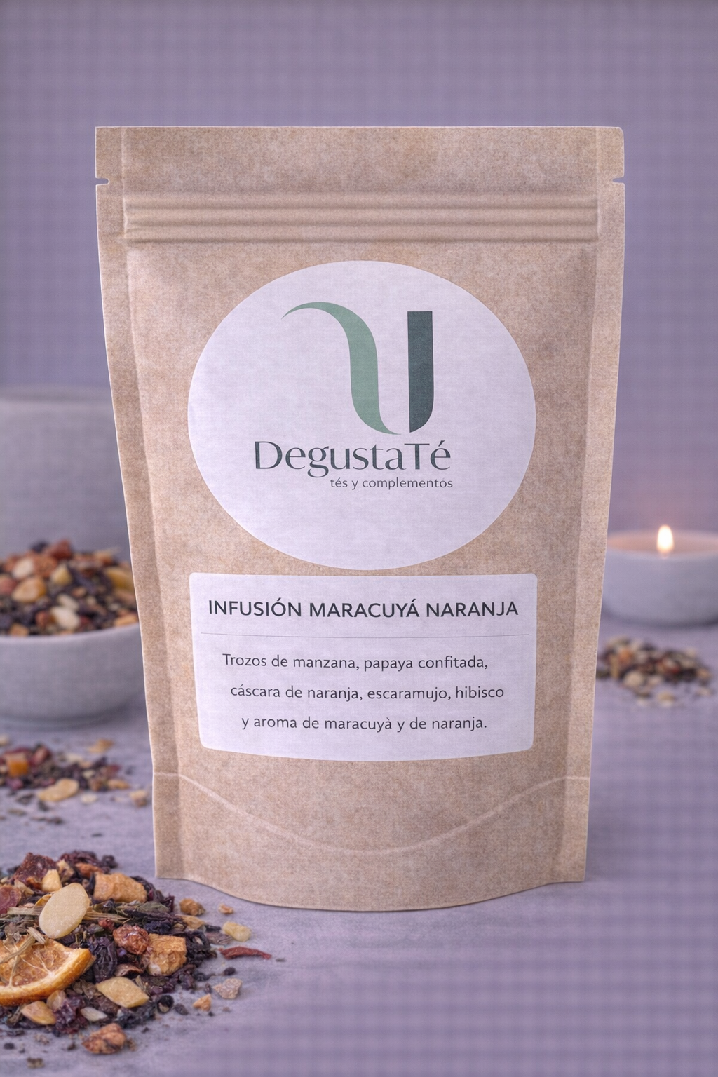 La infusión de maracuyá y naranja combina el toque exótico y ligeramente ácido del maracuyá con la frescura cítrica y dulce de la naranja. El resultado es una bebida aromática, equilibrada y muy agradable, ideal para disfrutar en cualquier momento del día.