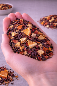 Trozos de manzana, papaya confitada, cáscara de naranja, escaramujo, hibisco y aroma de maracuyá y de naranja.