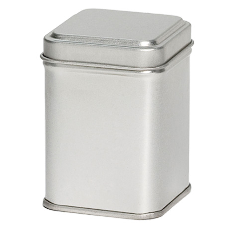 Lata plateada cuadrada, con tapa a presión, para conservar 50 gr. de té. 6cm largo. 6cm ancho. 8cm alto