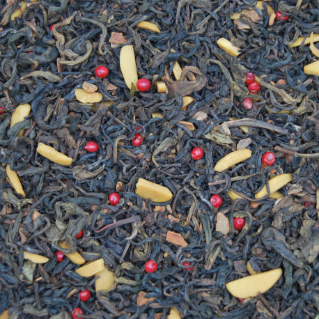 Té verde, trozos de canela, trozos de almendra, clavo, pimienta rosa, flor de nuez moscada y aroma de galleta navideña.