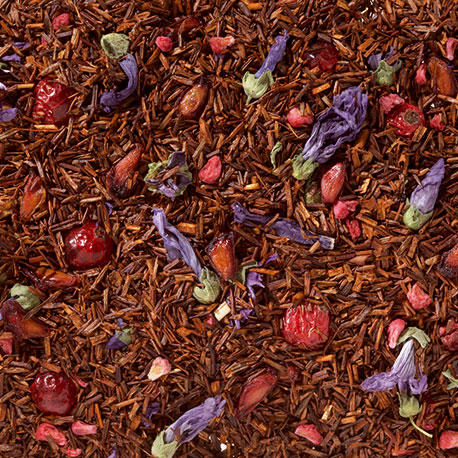 Rooibos, aromas, flores de malva, grosellas liofilizadas, frambuesas enteras liofilizadas, semillas de granada liofilizadas