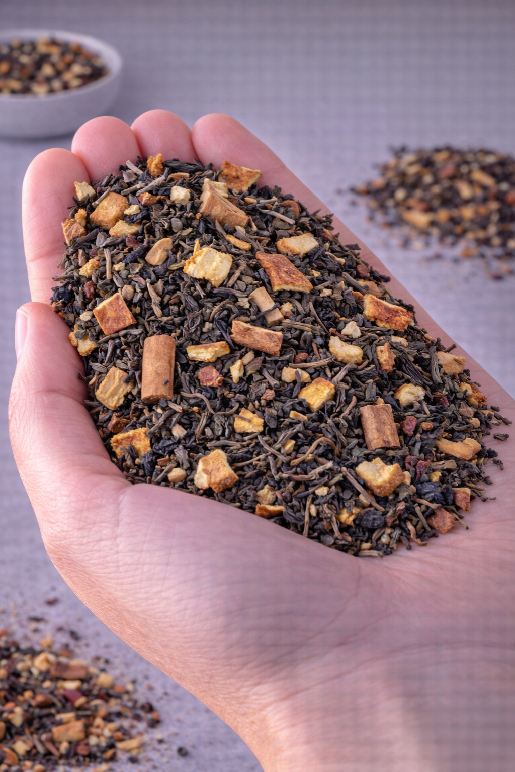 Té rojo Pu Erh, trozos de manzana, cáscaras de naranja, tronquitos de canela y aromas de vainilla, canela y naranja.