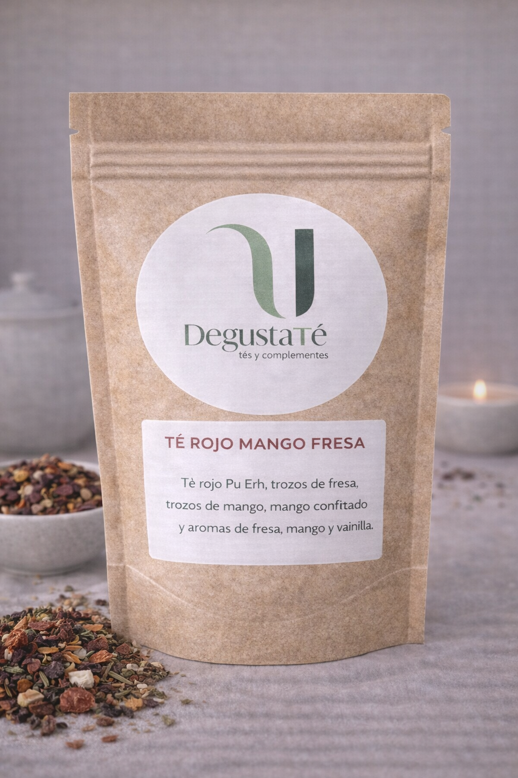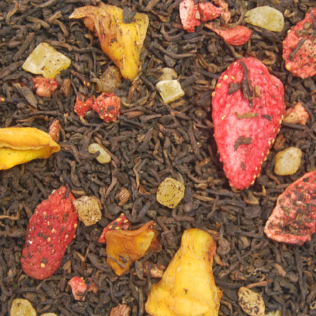 Te rojo Pu Erh, trozos de fresa, trozos de mango, mango confitado y aromas de fresa, mango y vainilla.